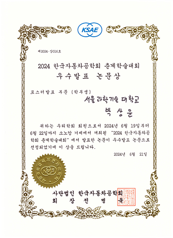 제목 | 기계·자동차공학과 박상윤, '2024 한국자동차공학회 춘계학술대회'에서 우수 발표 논문상 수상 | 날짜 | 2024-08-02 | 조회수 | 15858 |