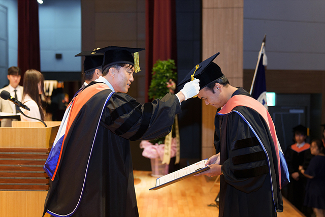 ▲대학원장이 학위 수여자의 학사모 술을 넘겨주고 있다.