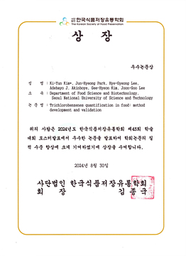 석사과정 김기윤 학생은 'Trichlorobenzens quantification in food : method development and validaiton' 라는 주제로 창의력과 신선함이 돋보이는 연구 결과를 발표하여 우수 포스터상을 수상하였다. 해당 연구는 잔유성유기오염물질 중 Trichlorobenzens를 GC-MS를 이용하여 최적화와 유효성 검증을 충족하였고 종합적인 모니터링과 위험 평가에 기여하였다 (지도교수 이준구).