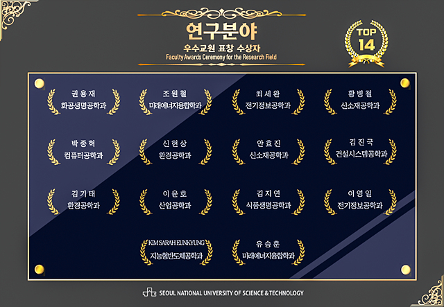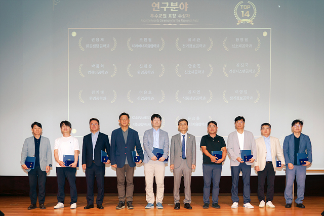 연구 분야 우수 교원은 총 14명으로, 화공생명공학과 권용재 교수, 전기정보공학과 최세완 교수, 컴퓨터공학과 박종혁 교수, 환경공학과 신현상 교수, 신소재공학과 안효진 교수, 미래에너지융합공학과 유승훈 교수 등 6명은 2022년부터 3년 연속 수상의 영예를 안았다. 전기정보공학과 이영일 교수, 미래에너지융합공학과 조원철 교수, 신소재공학과 황병철 교수, 건설시스템공학과 김진국 교수, 환경공학과 김기태 교수, 산업공학과 이윤호 교수, 식품생명공학과 김지연 교수, 지능형반도체공학과 KIM SARAH EUNKYUNG 교수 등 8명이 올해 새롭게 선정되었다. 학과별로 보면, 미래에너지융합공학과, 신소재공학과, 전기정보공학과, 환경공학과 등 4개 학과에서 2명씩 선정되었으며, 화공생명공학과, 컴퓨터공학과, 건설시스템공학과, 산업공학과, 식품생명공학과, 지능형반도체공학과 등 6개 학과에서 한 명씩 선정되었다.