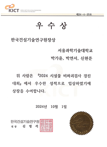 공과대학 건설시스템공학과 지능형구조설계연구실(Intelligent Structural Design Research Lab, 지도교수 김진국) 소속 박가윤(4학년), 신현준(3학년) 학생과 같은 학과 박연서(3학년) 학생이 2024년 8월 28일(수) 서울과학기술대학교에서 개최된 한국구조물진단유지관리공학회(KSMI) 2024 시설물 비파괴검사 경진대회에서 우수한 성과를 거두어, 2024년 10월 1일(화) “한국건설기술연구원장상”을 수상하였다.