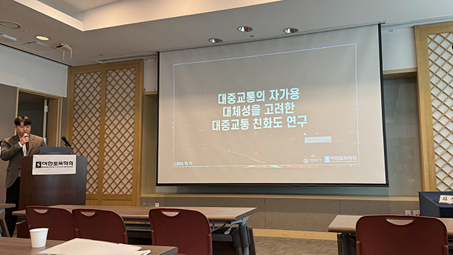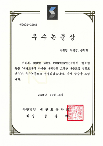 2024년 10월 16일~18일 ICC JEJU에서 개최된 토목학회 추계 학술대회 「KSCE 2024 CONVENTION CONFERENCE」에서 '대중교통의 자가용 대체성을 고려한 대중교통 친화도 연구'를 주제로 발표하였다. ![]() |