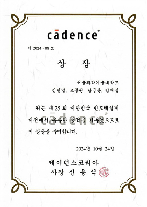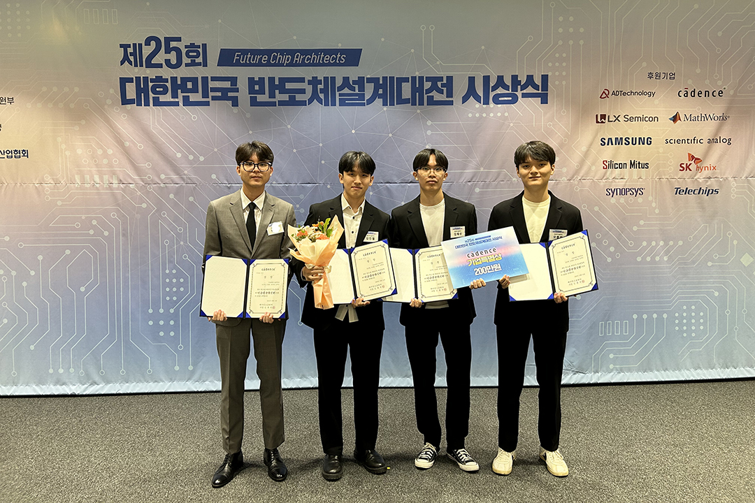 우리 대학 전자공학과 컴퓨터구조연구실(지도교수 이승은) 소속 김진열, 오종원, 김재성, 남궁훈 학부생이 지난 10월 24일 개최된 산업통상자원부 주최 '제25회 반도체설계대전'에서 기업특별상(cadence)을 수상했다.