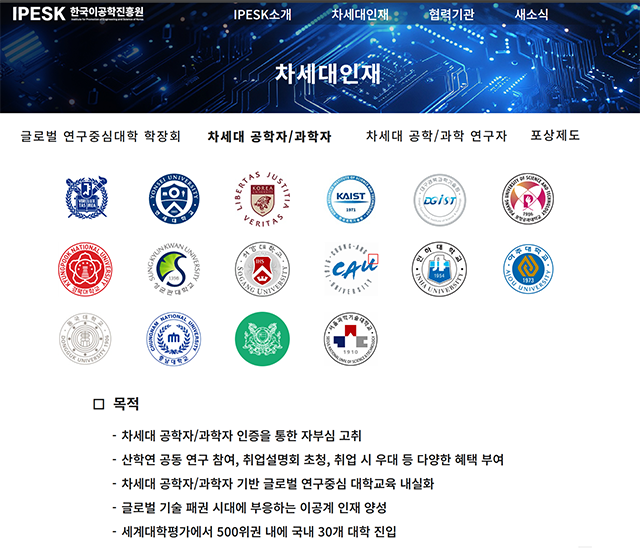 인재 양성 사업의 일환으로 추진하는 ‘IPESK 차세대 공학자’ 선정 사업은 글로벌 연구중심대학에 재학 중인 우수한 학부생 중 ‘IPESK 차세대 공학자’를 선정하여 대상 학생에게 다양한 혜택을 지원하는 사업이다.