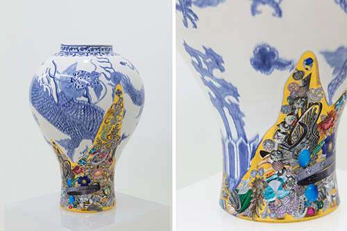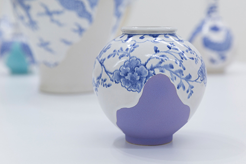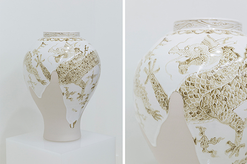 작가의 말대로, 도자는 당대의 사상과 미감, 생활상과 유행을 색과 형태, 문양을 통해 반영해 왔다. 유의정은 이러한 도자의 속성에 주목하여 혼종적인 시간성을 지닌 작품을 만든다. 그는 활동 초기부터 도자예술과 대중문화를 결합한 실험적 시도를 선보였다. ‘문화적 진실성’을 화두로 스타벅스 로고가 새겨진 도자를 박물관에서 유물이 전시되는 방식으로 제시하여 유물로서의 도자가 지닌 진위와 가치에 대한 질문을 던지기도 하고, 조각난 도자에 거울을 겹쳐 원본과 복제, 실재와 허상의 경계를 흐리는 실험을 선보이는 등 파격적인 형식으로 주목받았다. 최근 그의 대표적인 표현법은 백자 위에 유약을 흘러내리게 표현하고, 그 위로 과거와 현재의 대표적인 도상들을 덮는 것이다. 유약의 형상이 아래로 내려갈수록 희미해지고 왜곡되는 모습은 시간의 흐름 속에서 변화하는 문화적 상징을 나타낸다.