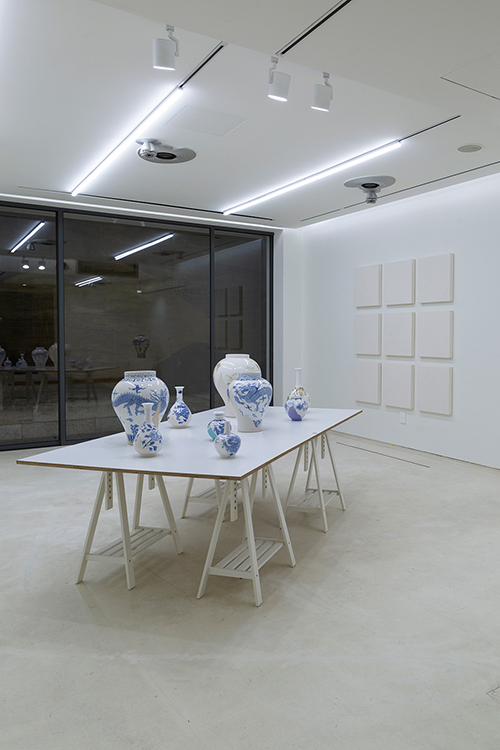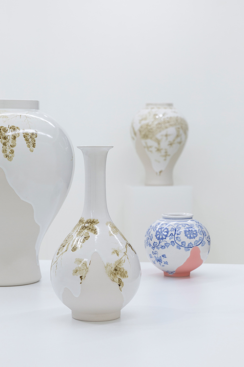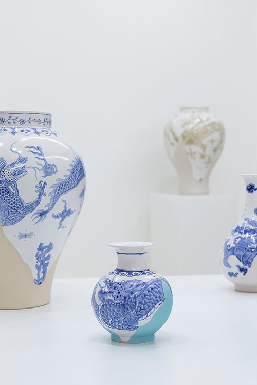 본 전시에서 유의정은 조선시대에 전성기를 이룬 백자를 모티브로 삼아 동시대성을 투영한 작품을 선보인다. 백자는 본래 조선 왕실의 위엄을 상징하는 왕실의 자기이면서도 그 소박한 형태로서 서민들에게 널리 애용되었으며 각 계층별로 청화백자와 철화백자가 주류를 이뤘다. 유의정은 이 같은 맥락을 지닌 백자가 동시대적 시각에서 어떻게 유효한 모습으로 나타날 수 있는지를 실험한다. 항아리 형태의 〈신-청화백자: 운룡문 보석대호〉 연작은 전통적 위계질서와 현대적 욕망이 교차하는 새로운 미학적 관계를 포착했다. 청화로 그려진 운룡문 아래에 현대의 명품 브랜드 로고와 보석이 공존하는 모습은, 과거와 현재의 가치체계가 충돌하고 융합하는 흥미로운 장면을 보여준다. 조선 초기의 병 양식을 차용하여 장수를 상징하는 모란과 다산을 상징하는 포도를 그려 넣은 〈신-청화백자: 모란조문 병〉과 〈신-철화백자: 포도문 병〉 작품들도 함께 전시된다. 흘러내리는 그림 아래 백자의 속살을 드러내듯 부드러운 톤의 컬러는 은은하고 매혹적인 인상을 자아낸다. 조선시대 상류층의 문화를 재해석한 작품부터, 조선 말 청화백자 다음으로 발달하며 서민층에서 이용된 철화백자를 재해석한 작품들은 편안한 미감 속에 웅크린 화려함을 제시한다.