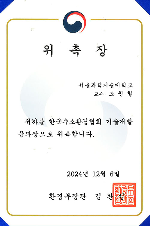 우리 대학 미래에너지융합학과 조원철 교수가 한국수소환경협회 기술개발분과위원장으로 위촉되었다.