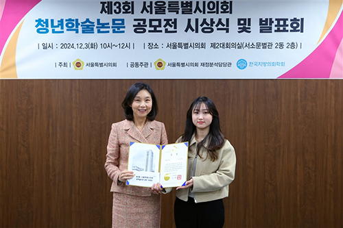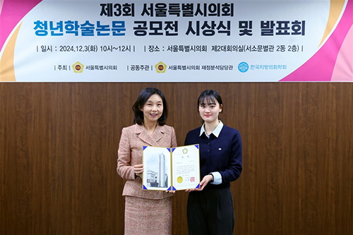 박유림, 최지은 학생은 이번 공모전에서 「서울 인구 감소 문제와 지방의회의 역할 및 기능에 관한 연구 : 자치구별 인구 과밀화 문제와 한국 풍조를 중심으로」 라는 제목의 논문으로 최우수작에 선정되었으며, 당선작은 서울특별시의회에서 발간하는 ‘예산과 정책’ 12월 호에 수록될 예정이다. |