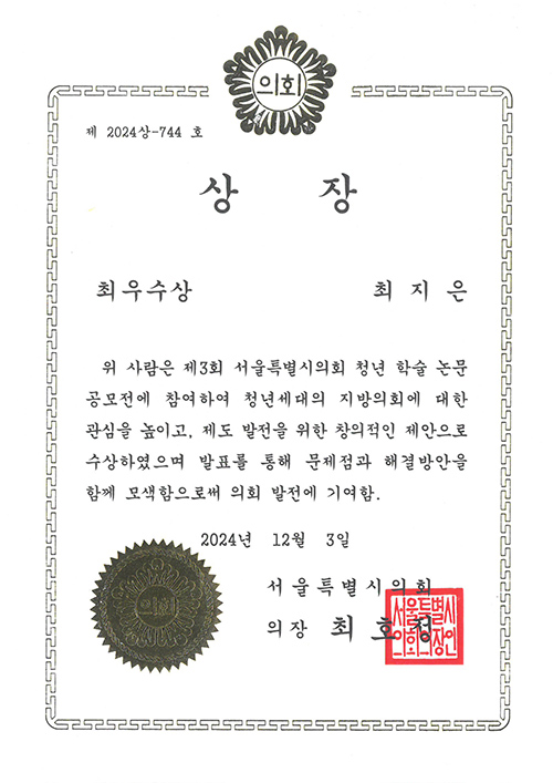제목 | 행정학과 재학생, 제3회 서울특별시의회 청년 학술논문 공모전 최우수상 수상 | 날짜 | 2024-12-17 | 조회수 | 12695 |