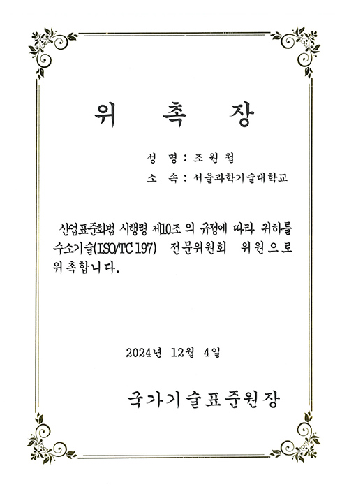 창의융합대학 미래에너지융합학과 조원철 교수가 수소기술(ISO/TC 197) 전문위원회의 위원으로 위촉되었다.