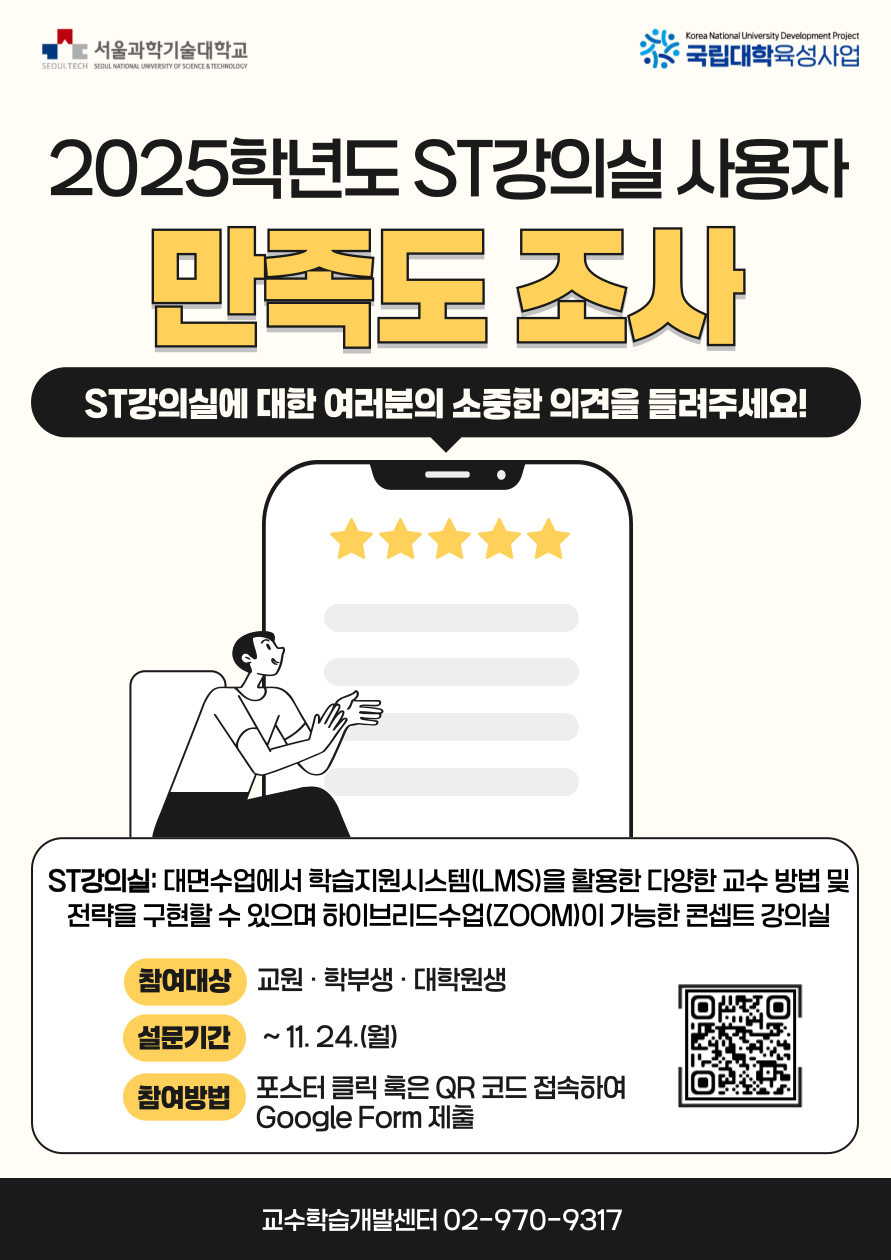 ST강의실의 운영 현황을 점검하고, 교수자와 학습자의 경험을 바탕으로 개선점을 파악하고자 만족도 조사를 실시합니다. (설문시간 약 1~3분 소요) 설문조사 링크 ▶ https://forms.gle/t28zmiLkDxcFPYFr6