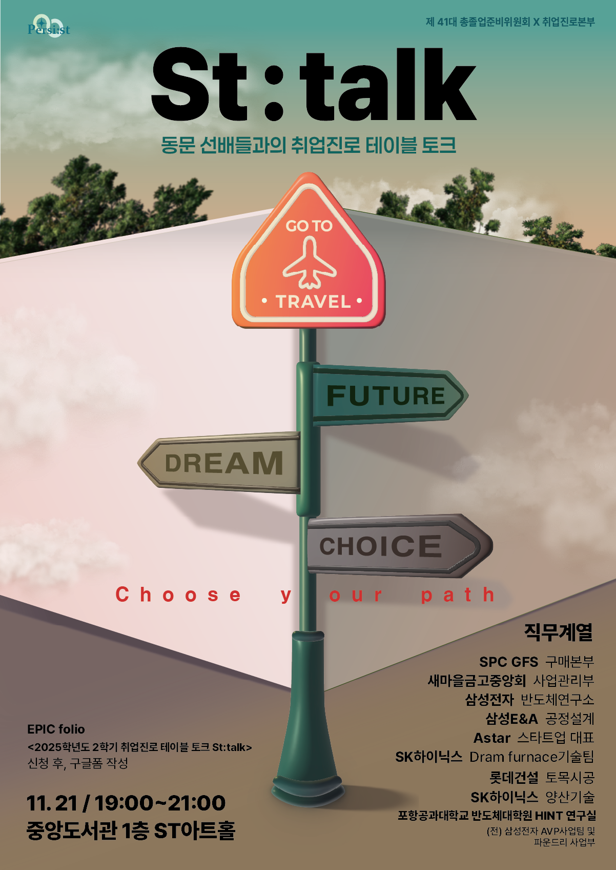 제41대 총졸업준비위원회 Persi:st에서 2025년 2학기 취업 진로 테이블 토크 St:talk를 개최합니다. St:talk는 테이블 토크 형식으로, 재학생이 관심 있는 직무/직업의 선배님 테이블에 앉아 편하게 질의 응답을 하며 대화할 수 있는 색다른 형태의 취업 강연입니다. 동일한 학과 선배, 혹은 관심 있는 분야 선배님의 직군에 대해 강연을 들어보고, 의미 있는 질문을 하며 자신의 미래 방향을 찾고 구체적으로 나아가는데 도움을 주고자 하는 목적을 두고 있습니다.