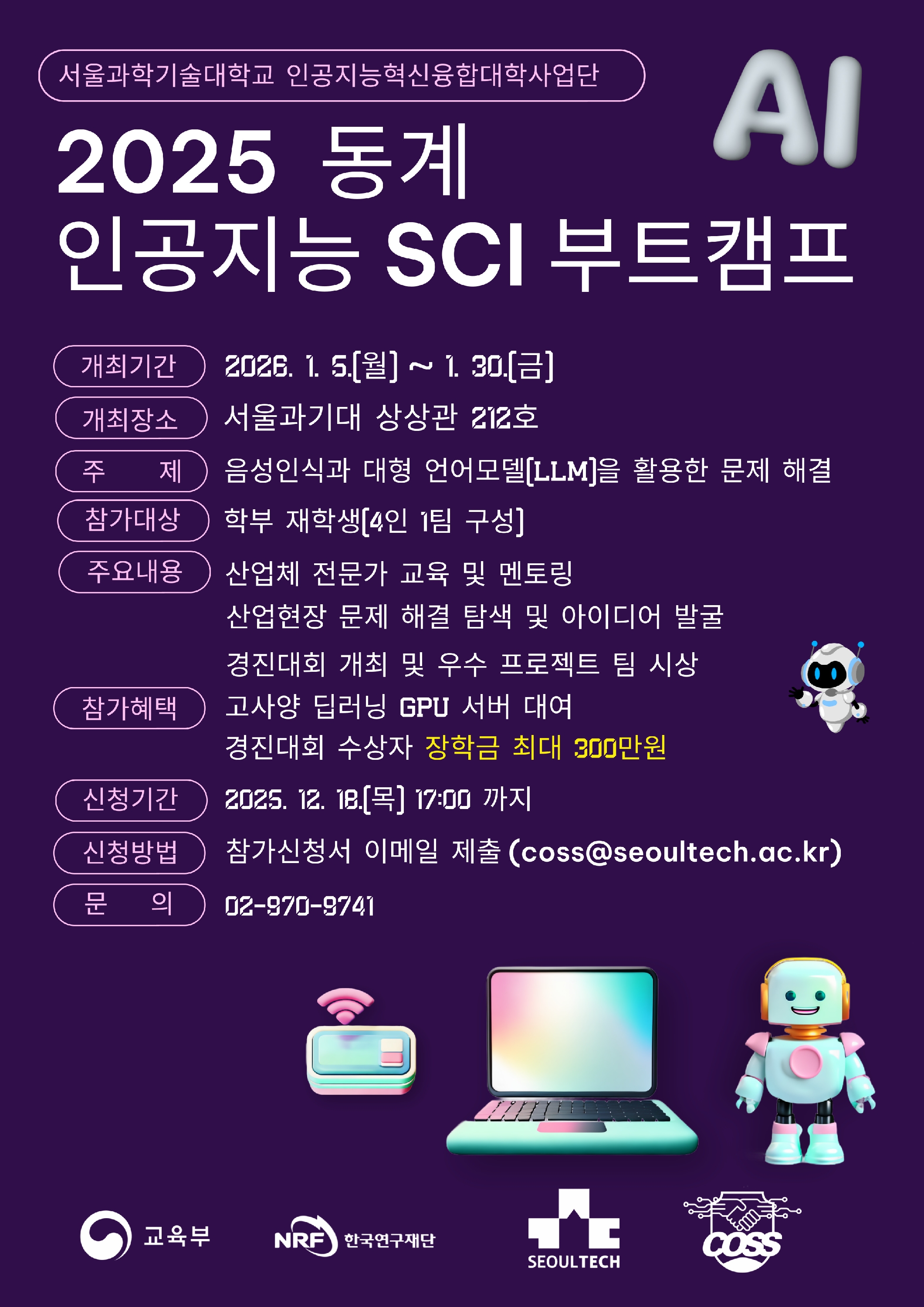 ⭐ 프로그램명: 2025 동계 인공지능 SCI 부트캠프 ⭐ 개최기간: 2026. 1. 5. (월) ~ 1. 30.(금) ⭐ 장 소: 상상관 212호 ⭐ 주 제: 음성인식과 대형 언어모델(LLM)을 활용한 문제 해결 ⭐ 주요내용 - 산업체 전문가 교육 및 멘토링 - 산업현장 문제 해결 탐색 및 아이디어 발굴 - 경진대회 개최 및 우수 프로젝트 팀 시상 ⭐ 참가대상: 본교 학부 재학생 (4인 1팀) - 팀 단위 참가 신청이 원칙이나, 팀 구성이 어려워 개별 신청시 사업단에서 임의로 팀을 구성할 수 있음 - 휴학생, 졸업유예생, 수료생, 2024학년도 전기 졸업예정자 신청 불가 ⭐ 참가자 혜택 - 고사양 GPU 및 딥러닝 서버 대여(NVIDIA RTX A6000) - 부트캠프 우수팀 시상 및 장학금 지급 ⭐ 세부일정