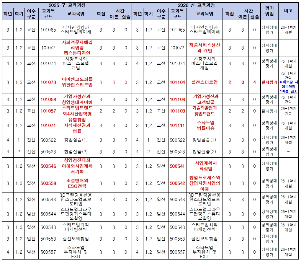 ★2026학년도 창업교육센터 교육과정(창업교과목)이 아래와 같이 개편되오니, 수강신청시 참고해주시기 바랍니다.★