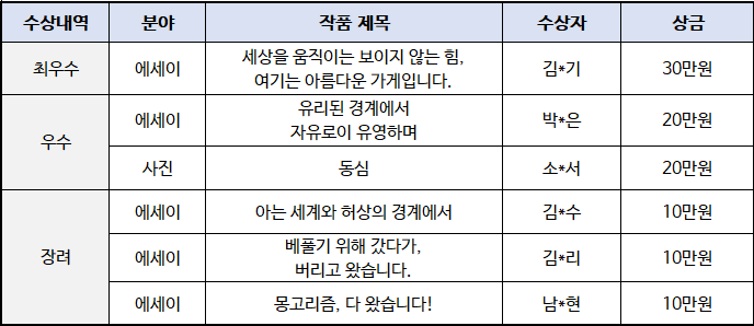2025학년도 봉사활동 후기 공모전 수상자를 다음과 같이 선정하였음을 알려드립니다.