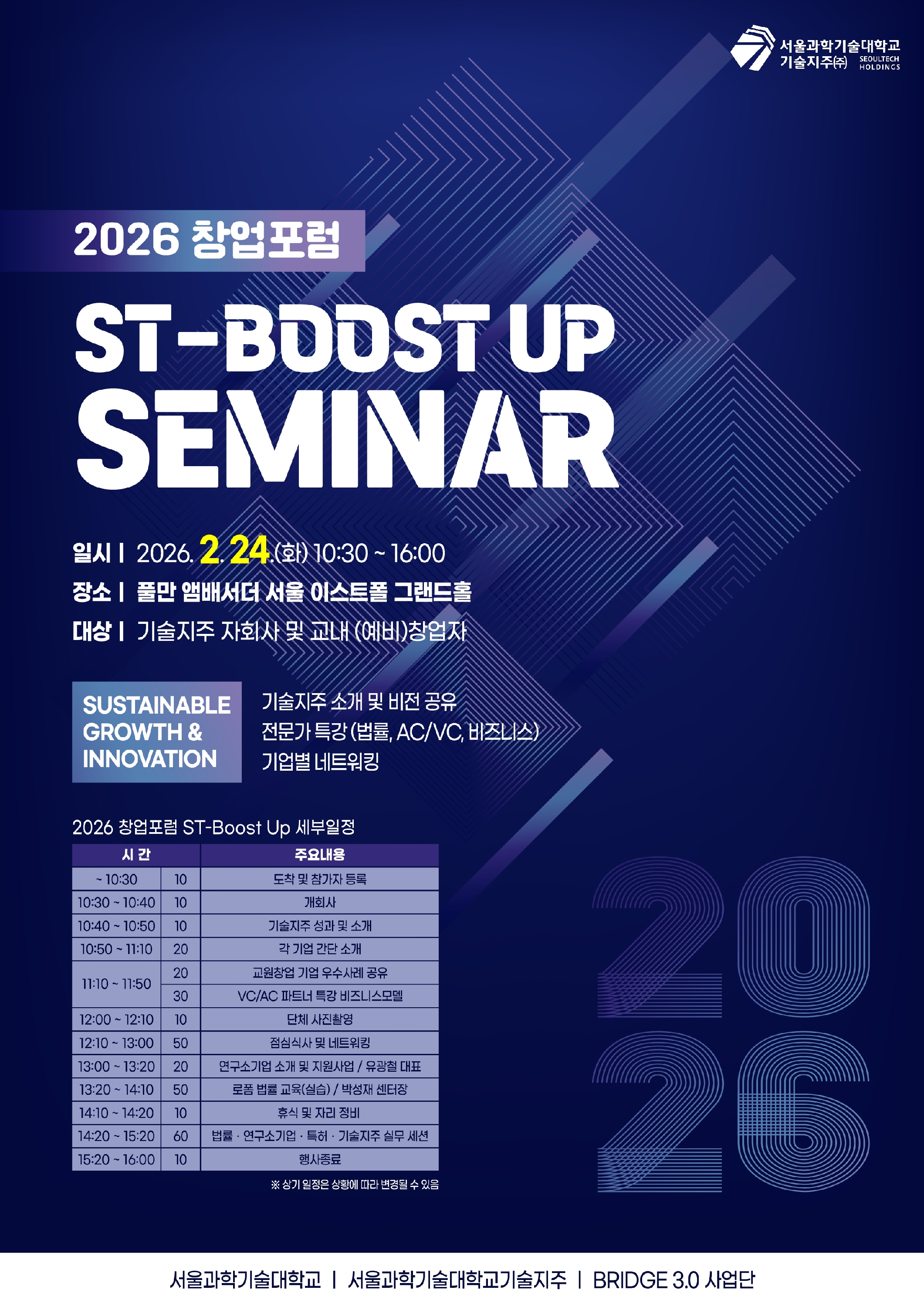 [기술지주] 창업포럼 ST-Boost Up Seminar 참가신청 안내 ( ~20일 ) |