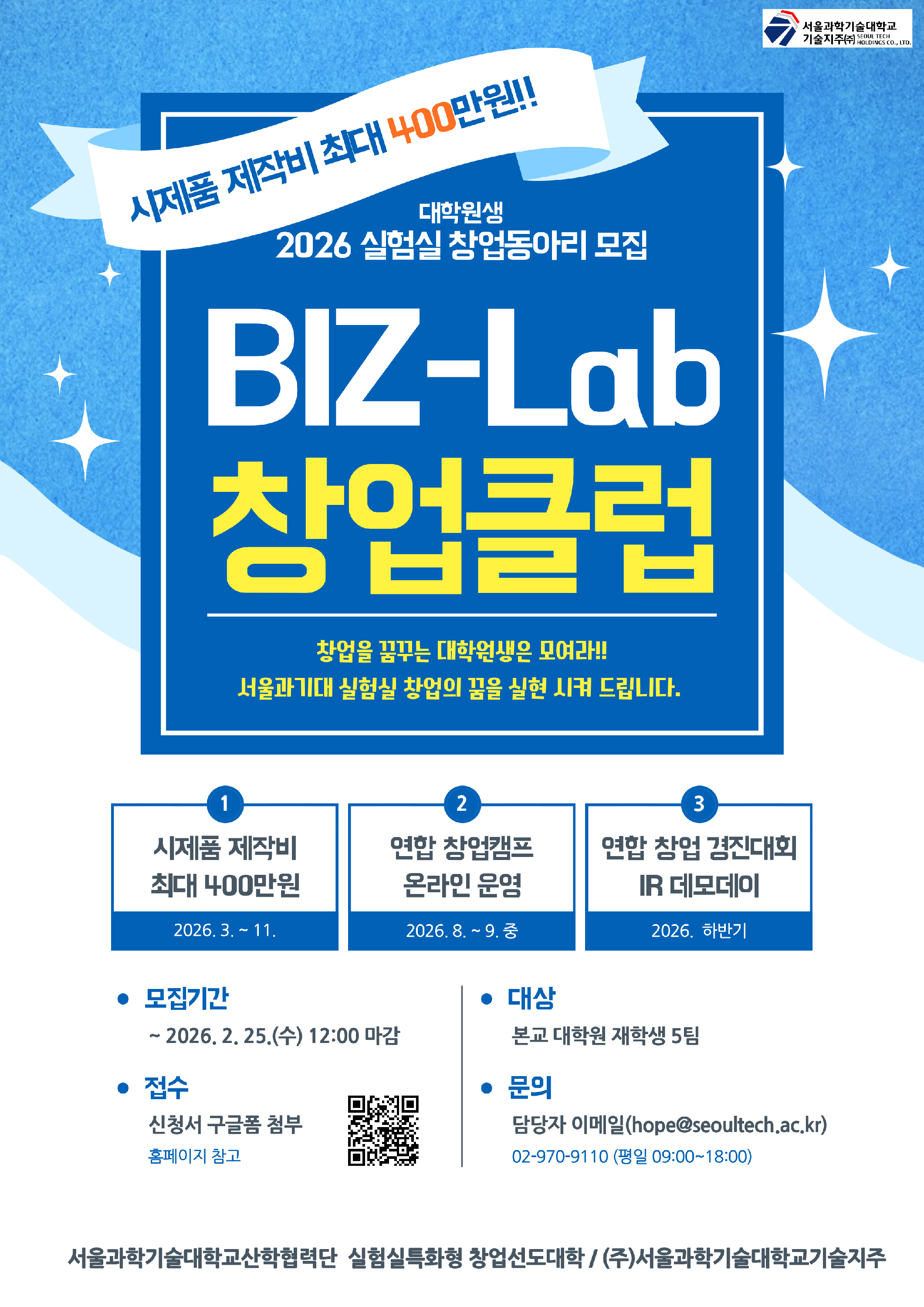 "2026 BIZ-Lab 창업클럽" 모집안내서울과학기술대학교 기술지주 에서는 창의적인 아이디어를 가진 대학원생을 대상으로 다양한 창업 인프라 지원을 하고자"2026 BIZ-Lab 창업클럽" 을 모집하고 있습니다.시제품 제작비 최대 400만원의 지원금을 받을 교내 대학원생들의 많은 참여 바랍니다.