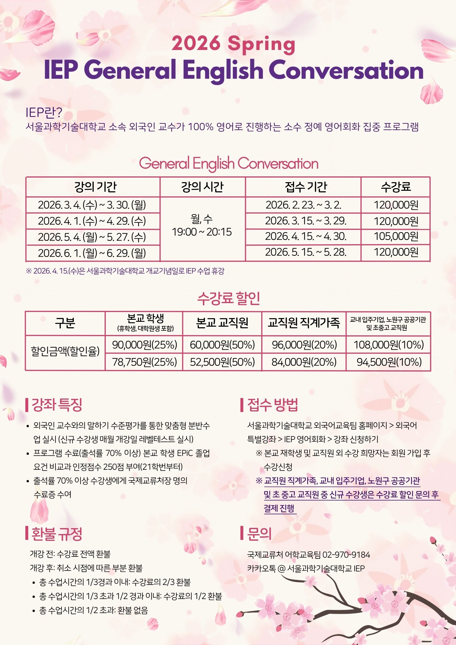 ▶ 신청 바로가기: https://language.seoultech.ac.kr/noncredit/iep/conversation