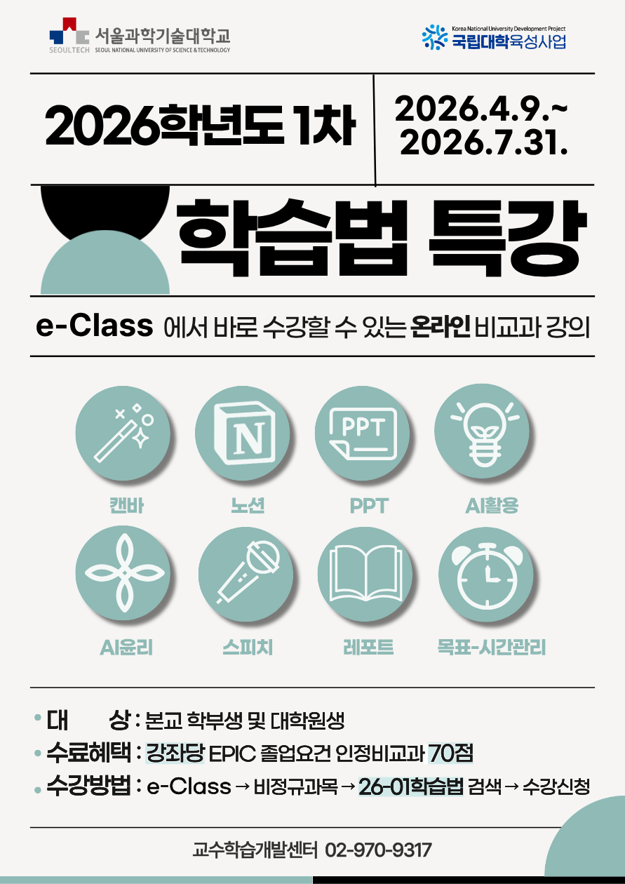 1. 학습 대상: 학부생 및 대학원생 2. 학습 기간: 2026. 4. 9.(목) ~ 2026. 7. 31.(금) ※ 2026. 8. 1.(토) 학습 불가 3. 학습 방법: e-Class 비정규과목 개별 수강신청하여 기간 내 자유롭게 학습 ※ 수강신청 방법: e-Class → 비정규과목 → (26-01학습법) 검색 → 원하는 강좌 선택하여 수강신청 4. 이수 기준: 강좌 내 공지사항 확인