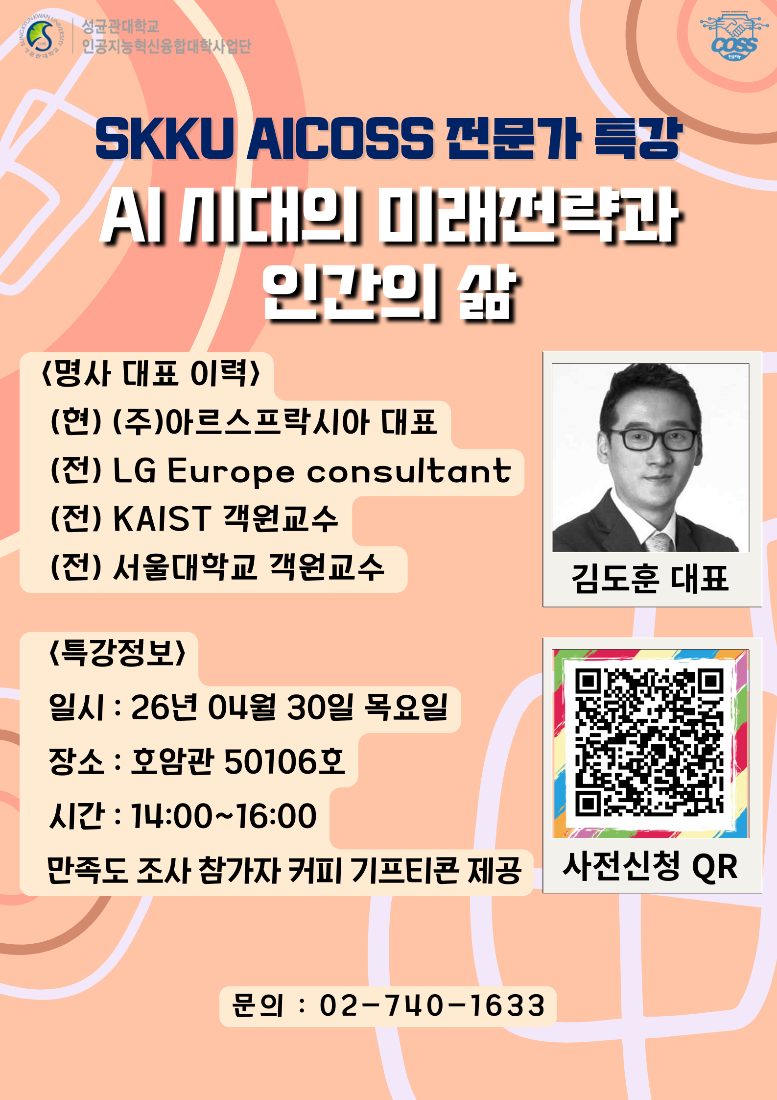 ⭐ 일 시: 2026. 4. 30.(목) 14시~16시 ⭐ 장 소: 성균관대학교 인문사회과학캠퍼스 호암관 50106호 ⭐ 강 의 자: 아르스프락시아 김도훈 대표 ⭐ 강의주제: AI 시대의 미래전략과 인간의 삶 ⭐ 참가대상: 서울과기대 구성원 누구나 ⭐ 참가혜택: 수강 후 만족조 조사 응답자 전원 스타벅스 기프티콘 제공 ⭐ 문 의: 성균관대학교 인공지능혁신융합대학사업단 02-740-1633