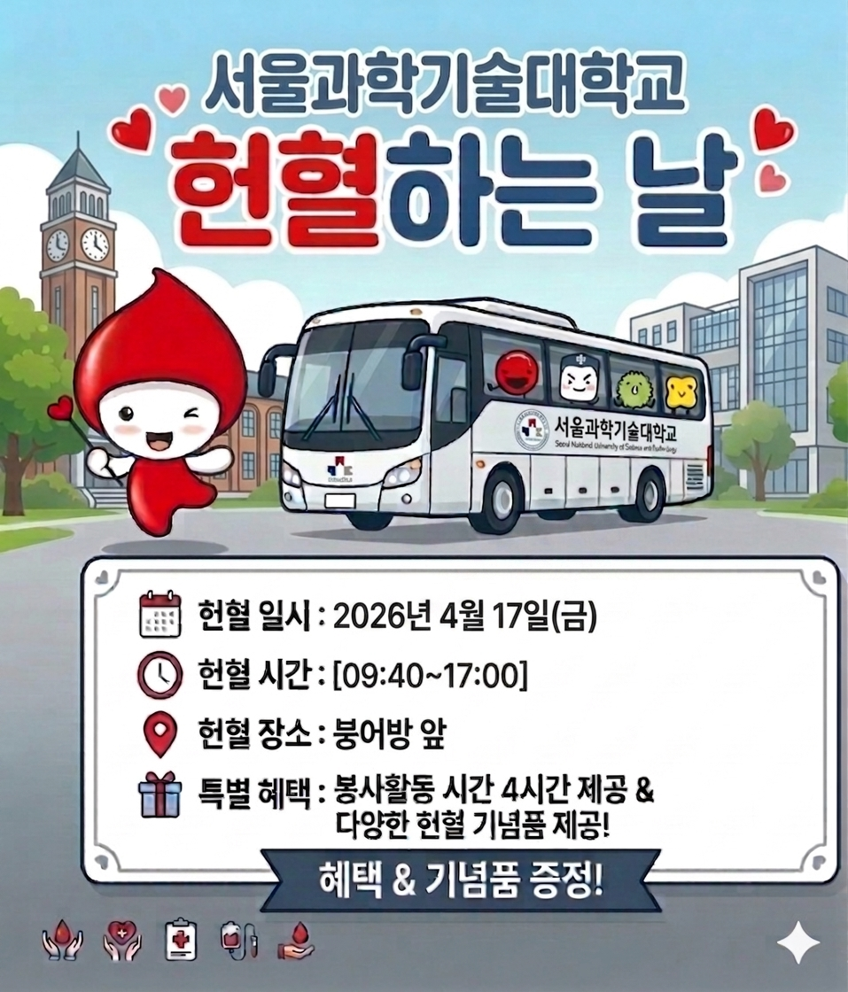 가. 헌혈 일자: 2026.4.16.(금) 09:40~17:00 나. 헌혈 방법: 헌혈버스(45인승) 내 전혈 헌혈 다. 헌혈 장소: 다산관과 붕어방 사이 주차장 라. 헌혈자 혜택 1) 헌혈자의 건강상태 체크(레드커넥트 어플 통해 확인 가능)