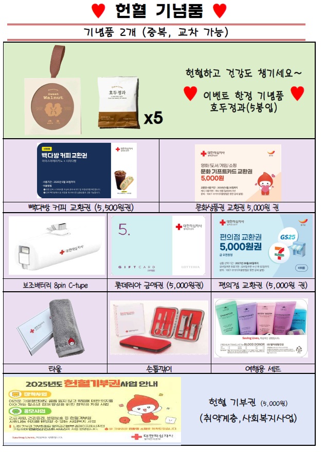 2) 자원봉사시간 인정(4시간, VMS에서 발급 가능) 3) 헌혈증서 발급 및 헌혈자 기념품 제공 ※ 헌혈자 기념품은 이벤트 일정에 따라 변동 가능