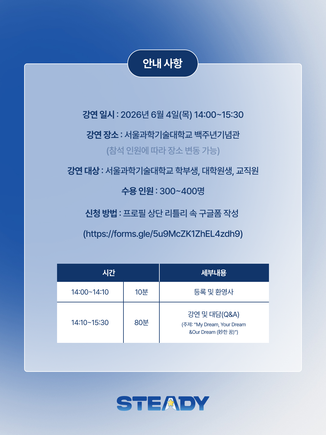 ◆강연 대상: 서울과학기술대학교 학부생, 대학원생, 교직원