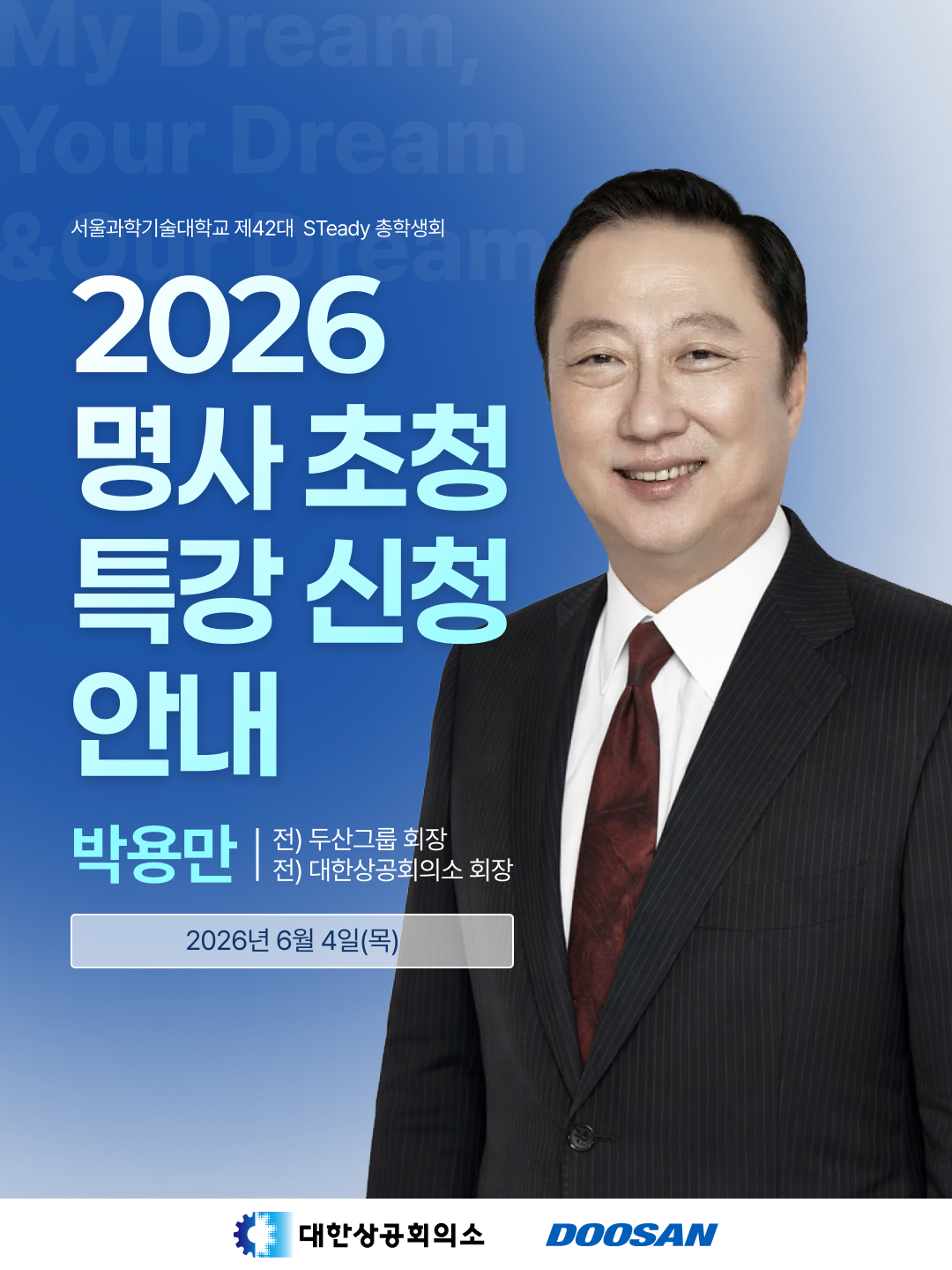 이번 명사 특강은 전 두산그룹 회장이자, 전 대한상공회의소 회장을 역임하신 박용만 회장님을 초청하여 'My Dream, Your Dream & Our Dream (妙한 꿈)’을 주제로 깊이 있는 강연이 진행될 예정입니다.