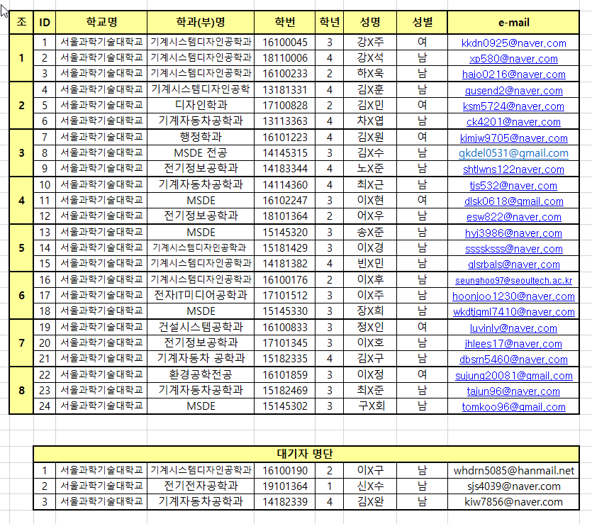 * 조편성 및 선발학생 공지합니다. * 지원자가 많았던 만큼, 개인사정으로 참가하지 못하는 학생은 미리 연락주세요. * 선발학생들은 21일(수) 오전 9시까지 Innovation Factory(하이테크관 104호)로 오시면 됩니다. * 문의: 02-970-9234