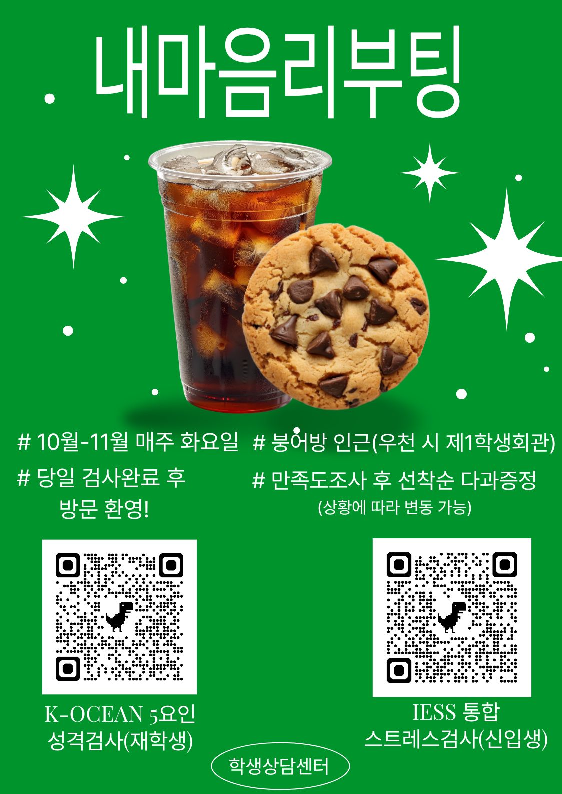 | 제목 | [학생상담센터] 2025학년도 맞춤형 온라인 심리검사 2차 오프라인 행사 '내마음리부팅' 참여 안내(국립대학육성사업) | ||||