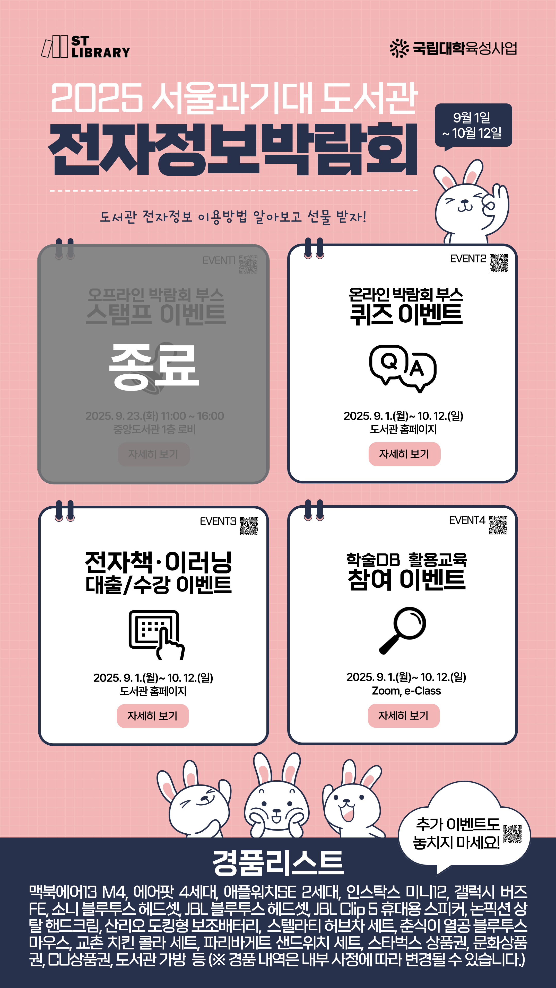 | 제목 | (마감임박)🐰 2025 도서관 전자정보박람회 개최(~10/12) 🐰 에어팟 / 인스탁스미니 / 교촌치킨 / 파리바게트... | ||||
