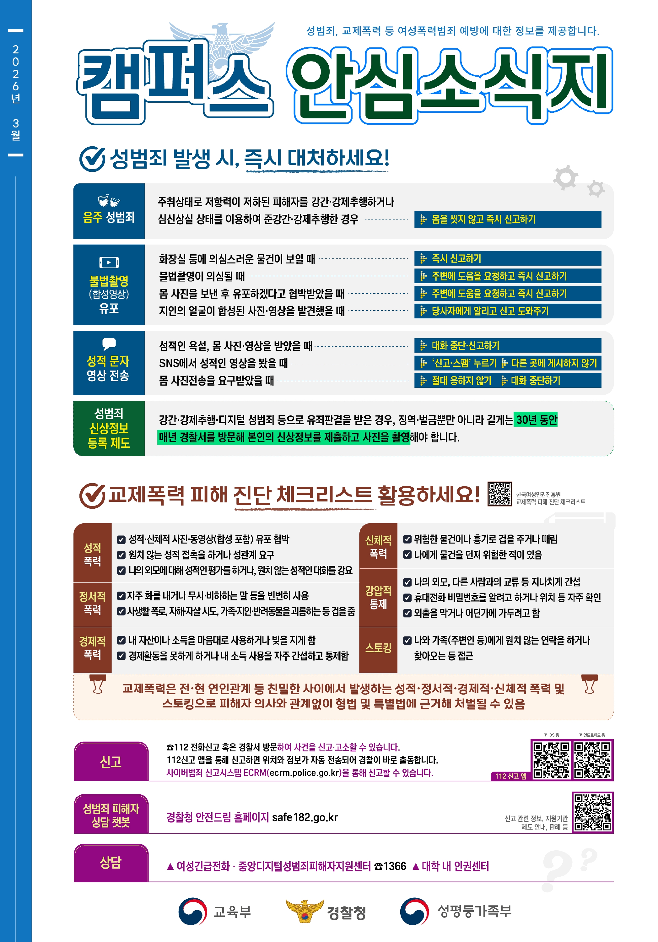교육부와 경찰청이 협력한 대학 내 성범죄, 교제폭력(스토킹) 등의 예방 및 근절을 위한 캠퍼스 안심 소식지