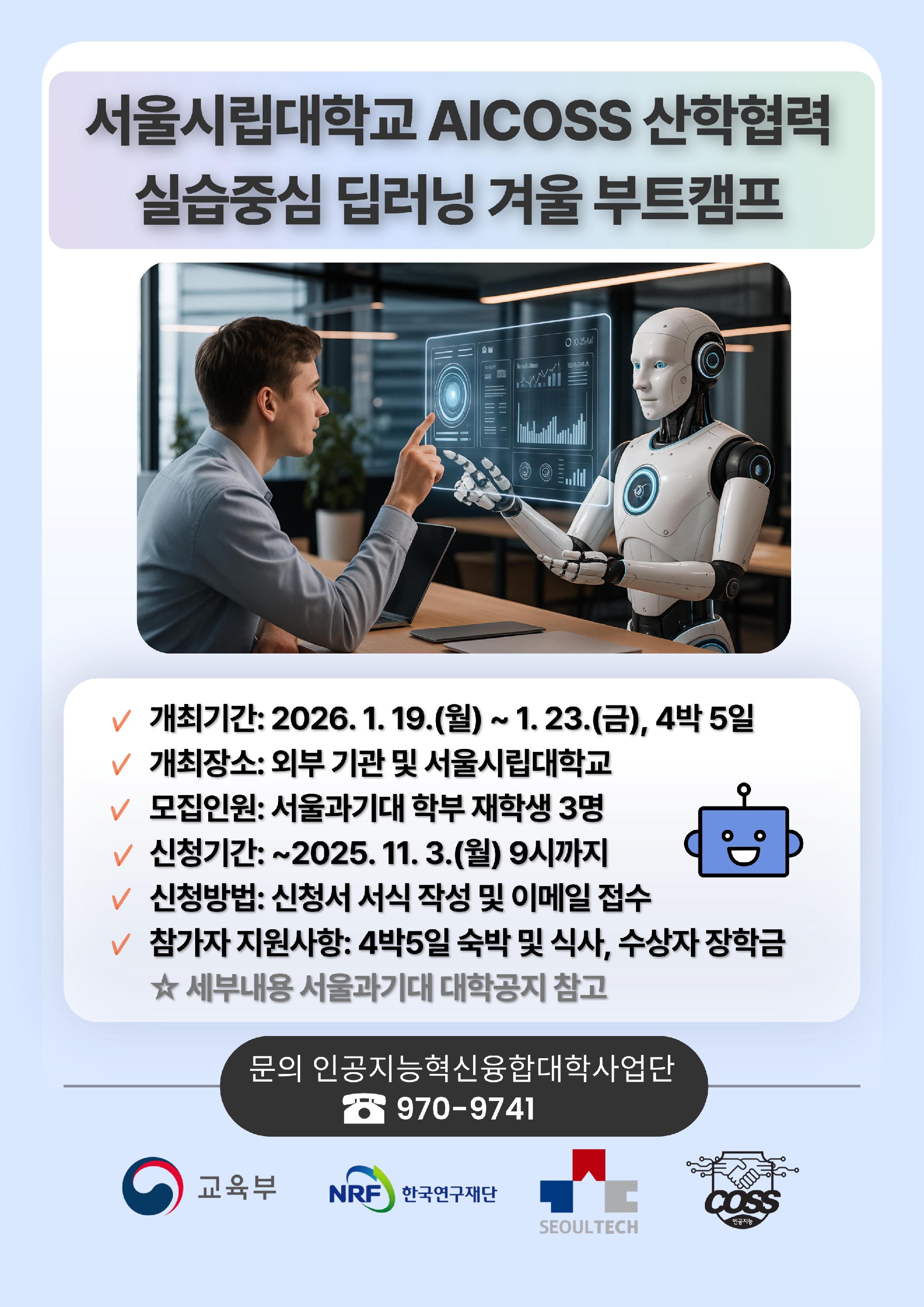 서울시립대학교 인공지능혁신융합대학사업단이 개최하는 2025학년도 AICOSS 산학협력 실습중심 딥러닝 겨울 부트캠프 참가자를 아래와 같이 모집하오니 관심있는 학생들의 많은 참여 바랍니다.