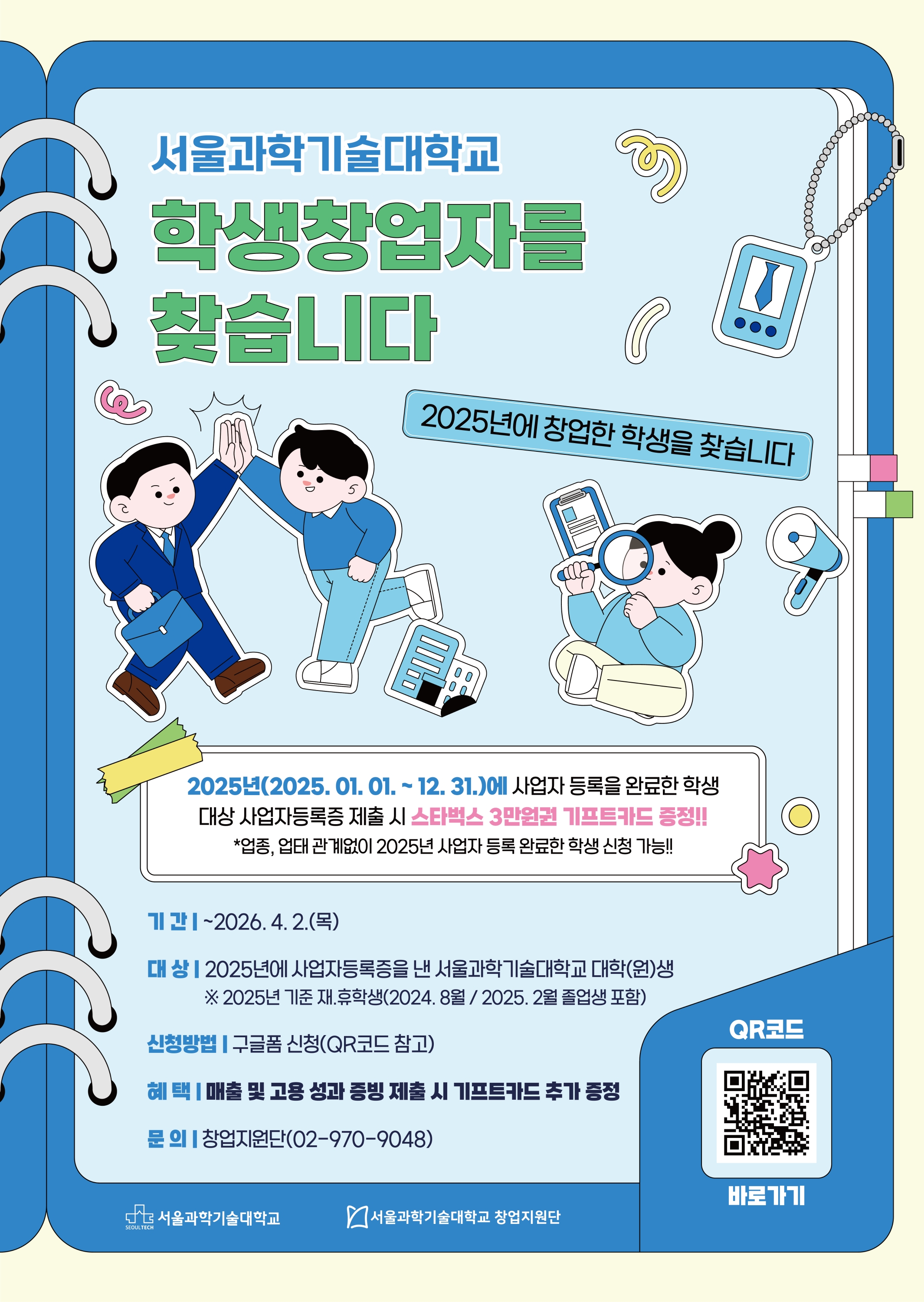 2025년(2025. 01. 01~12. 31.)에 사업자 등록을 완료한 학생 대상 사업자등록증 제출시 스타벅스 기프트카드 증정!! *업종, 업태 관계없이 2025년 사업자 등록완료한 학생 신청 가능!!