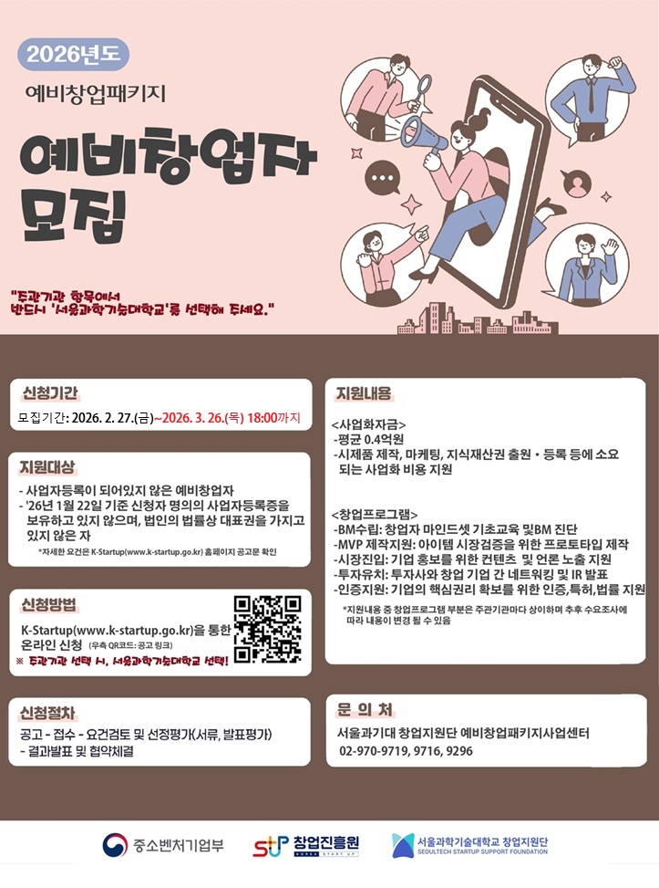 추가로, 사업신청 시 주관기관은 반드시 "서울과학기술대학교"로 선택 부탁드립니다~ ----------------------------------------------아래---------------------------------------------- *모집기간: (기존) (변경)2026. 2. 27.(금)~2026. 3. 26.(목) 18:00까지 -주관기관 선택 시 "서울과학기술대학교"로 부탁드립니다. 많은 관심 부탁드리며 궁금하신 점은 언제든 연락주시기 바랍니다! 감사합니다.
