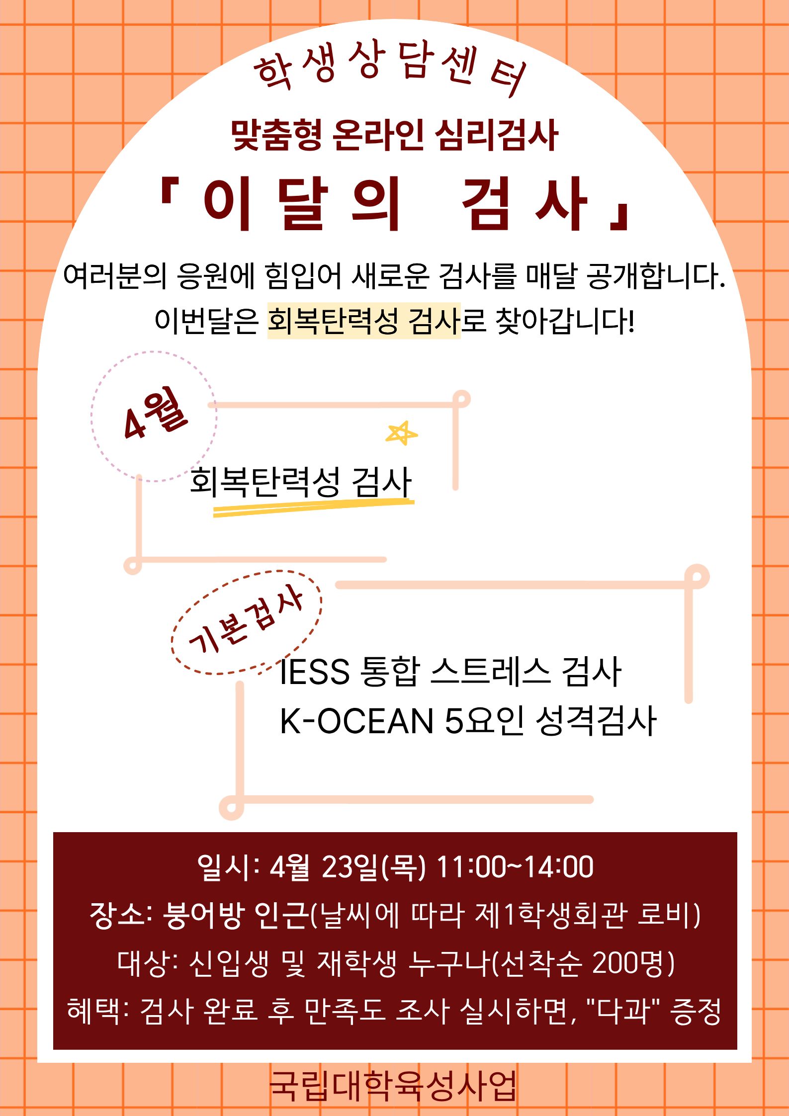 ✔ 행사 내용 - 재학생: K-ocean 5요인 성격검사 (나의 성격 유형을 심층적으로 알아보고 이해하기) - 신입생: IESS 통합스트레스 검사(나의 대학 생활 스트레스를 진단하고 관리 방법 알기) + 재학생: 이달의 검사 '회복탄력성 검사'