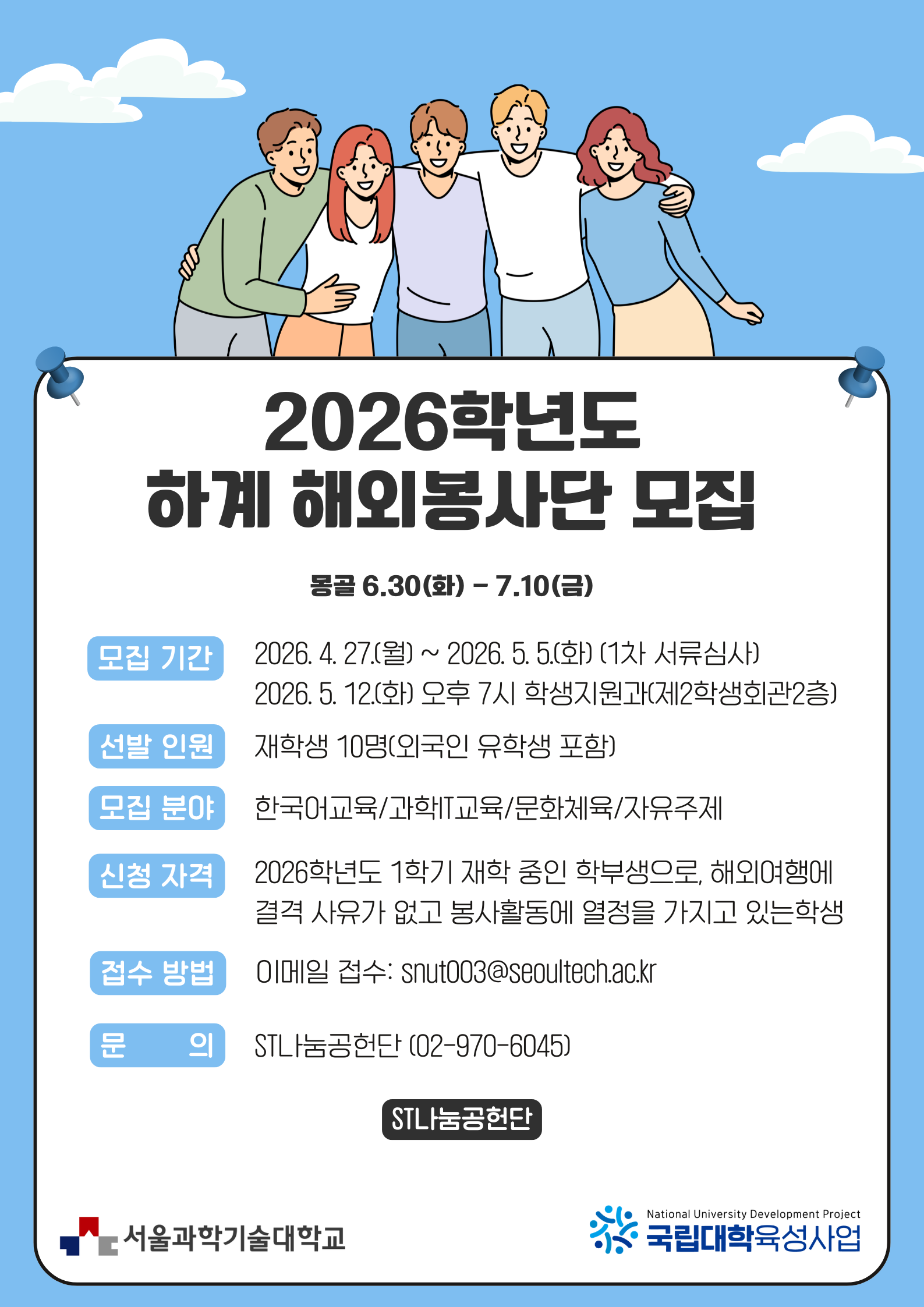 ○ 신청자격: 2026학년도(1학기) 학부 재학생으로, 해외여행에 결격사유가 없고 봉사활동에 열정을 가지고 있는 학생 ○ 신청기간: 2026. 4. 27.(월) ~ 5. 5.(화) ○ 신청방법: 학생지원과 메일 접수(snut003@seoultech.ac.kr) - (필수 제출서류) 붙임1 ~ 붙임5 서식 ※ 붙임 6 서식은 출발 전 제출 - (추가 제출서류) 봉사활동 경력증명서, 성적증명서 등 ※ 우대사항: 총평점평균 성적 3.0점 이상(2025학년도 2학기 기준) ※ 필수 제출서류 5가지 중 1가지라도 미작성 및 미제출시 최종접수 불가 - (1차 서류심사) 프로그램 적합성/창의성, 봉사활동 경력, 성적 등 - (2차 면접심사) 적합성, 성실성, 활동계획의 구체성 등을 평가하여 최종 선발 - 합격자 중 포기하는 인원이 발생할 경우, 차순위 순서대로 선발