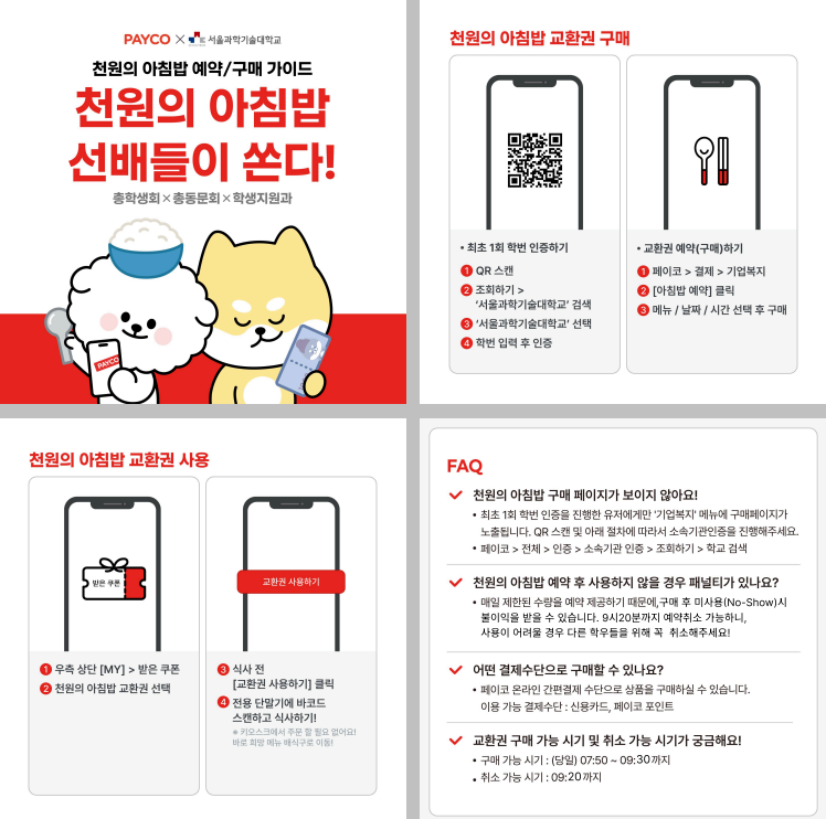 2025년에 운영하였던 "천원의 아침밥' 을 2026학년도 개강과 함께 다시 시작하니, 든든하게 아침식사하고 하루를 시작하세요~~~~ (페이코앱으로 학생인증을 통해 서울과기대 재학생만 먹을 수 있으니 신입생은 페이코앱 다운받아 이용해주세요~)